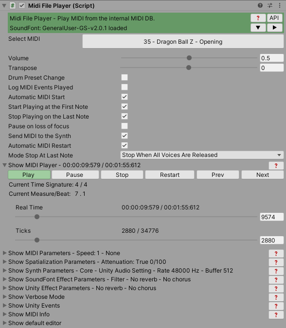 Also, you can use directly the MidiFilePlayer gameObject in your script to create a more complex interaction. See an example with source code at the end of this page.
