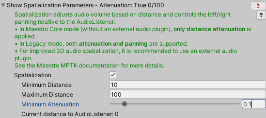 • MPTK_PauseOnMaxDistance: The MIDI player automatically pauses when the listener’s distance exceeds MPTK_MaxDistance. By default, this setting is true (pause), consistent with the previous version. By setting it to false, the MIDI player will continue to play MIDI, but no sound will be heard due to the distance.